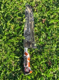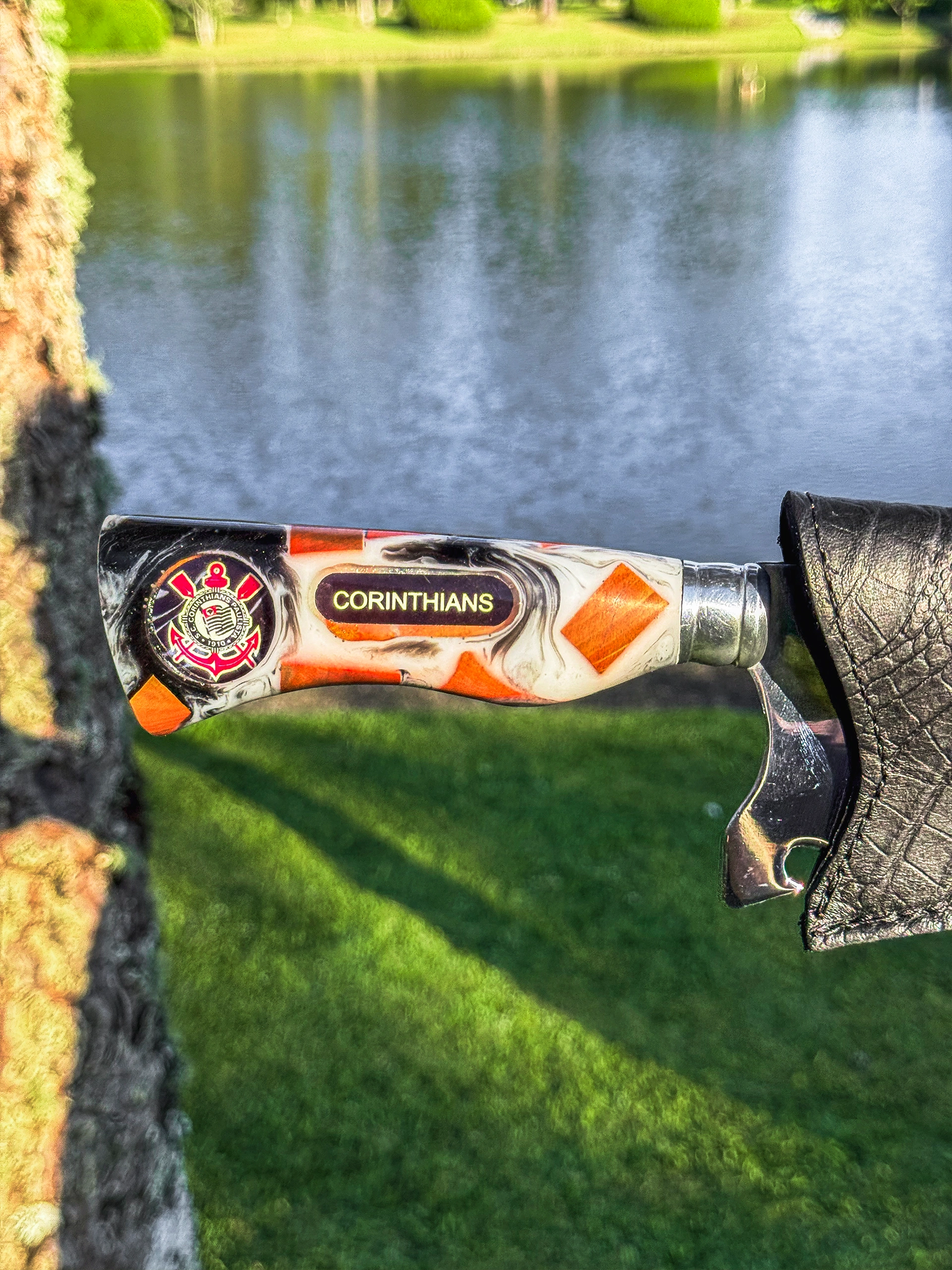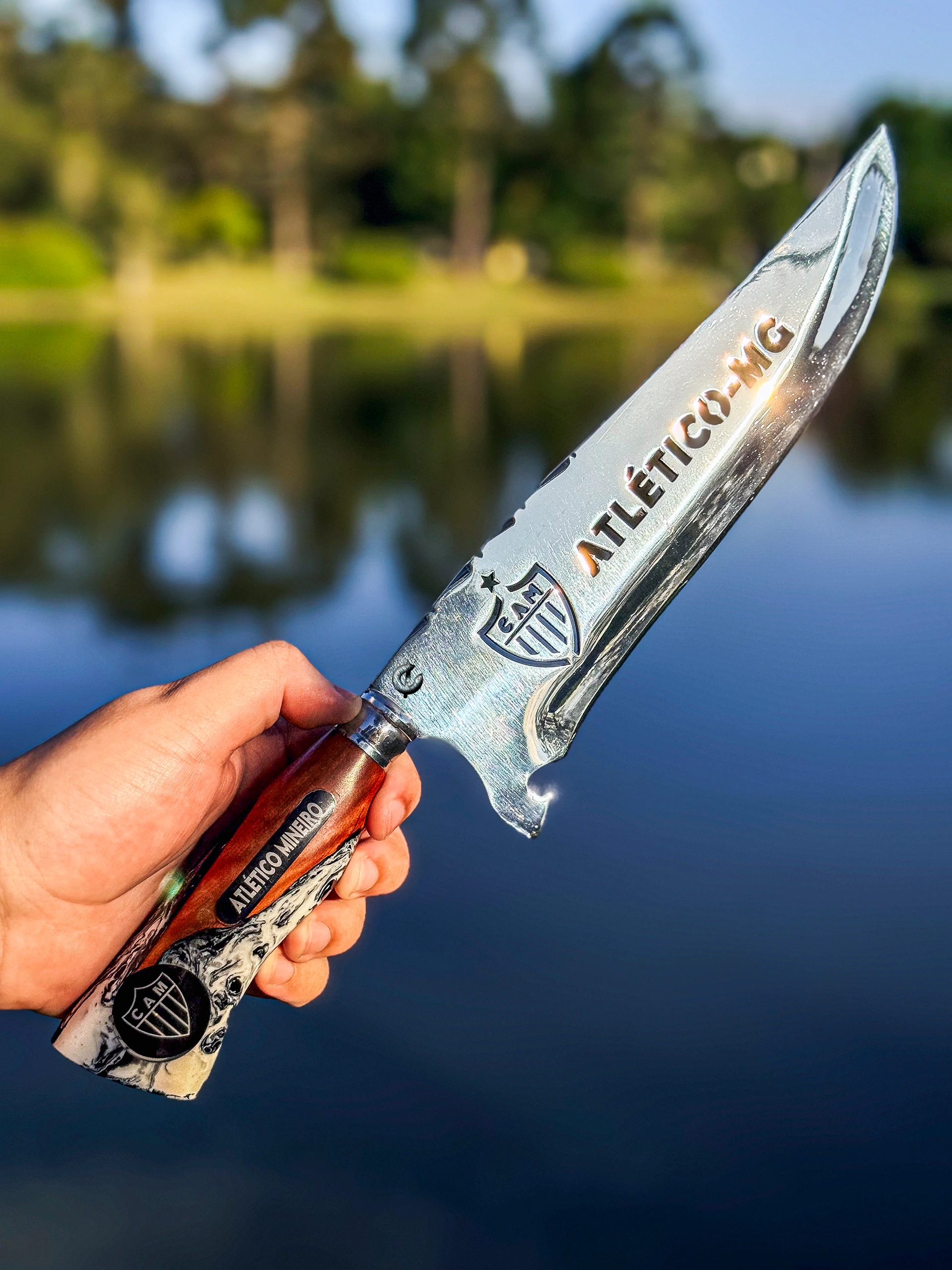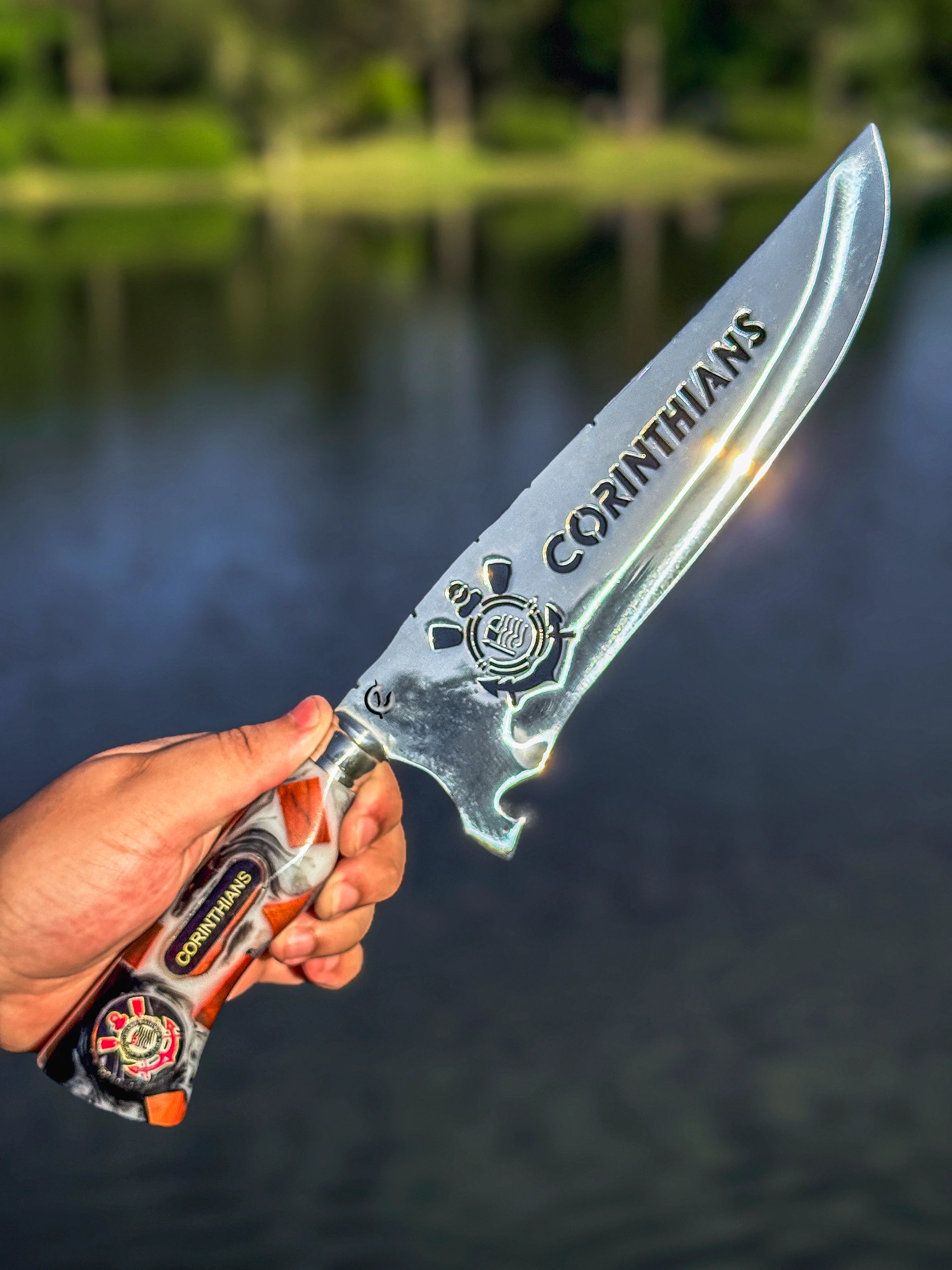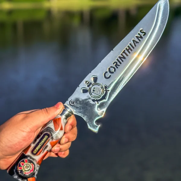 Faca resistente e funcional, ideal para churrasco, camping, pesca e atividades outdoor. Produzida artesanalmente, cada peça carrega personalidade única e acabamento diferenciado, garantindo não só desempenho no corte, mas também um visual marcante para quem carrega seu time no dia a dia.
